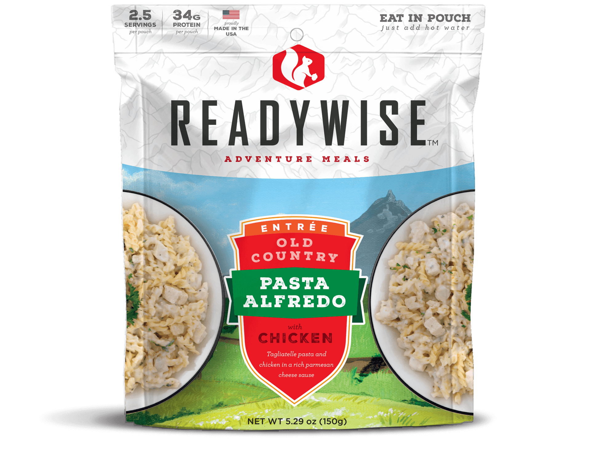 Each pouch of Old Country Past Alfredo with chickens contains 2.5 servings and is resealable. These pouches are lightweight making the easily portable for any outdoor adventure. Just add water and you can eat directly from the pouch.