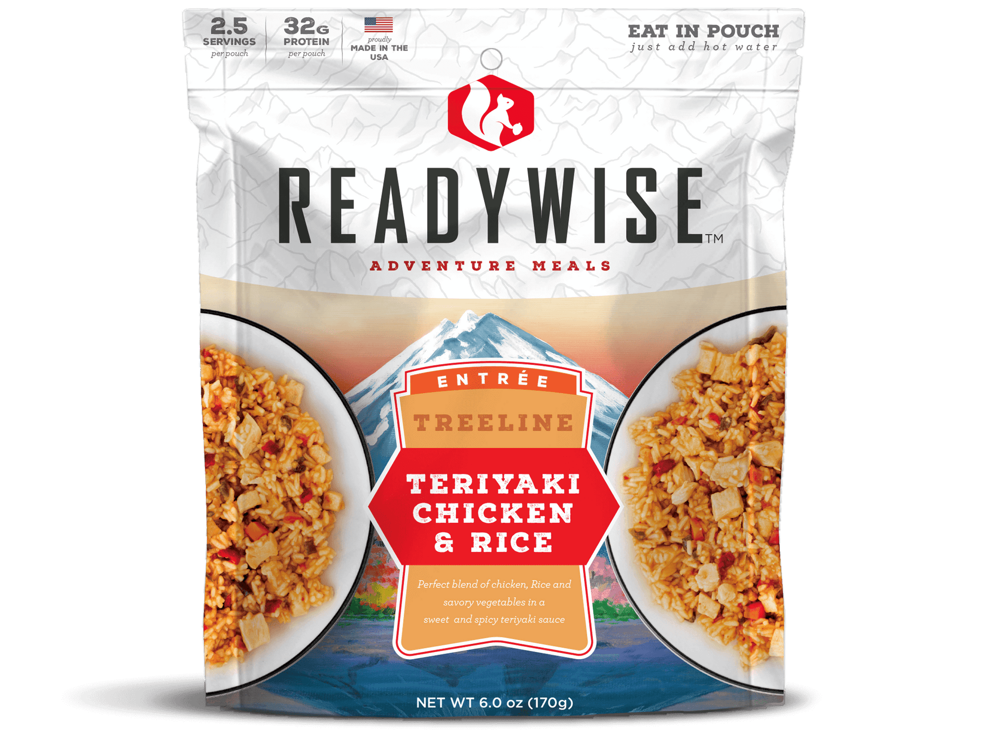 Each pouch of Tree line Teriyaki Chicken and Rice contains 2.5 servings and is resealable. These pouches are lightweight making the easily portable for any outdoor adventure. Just add water and you can eat directly from the pouch.