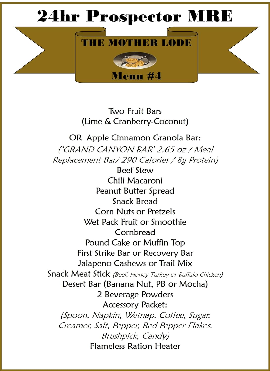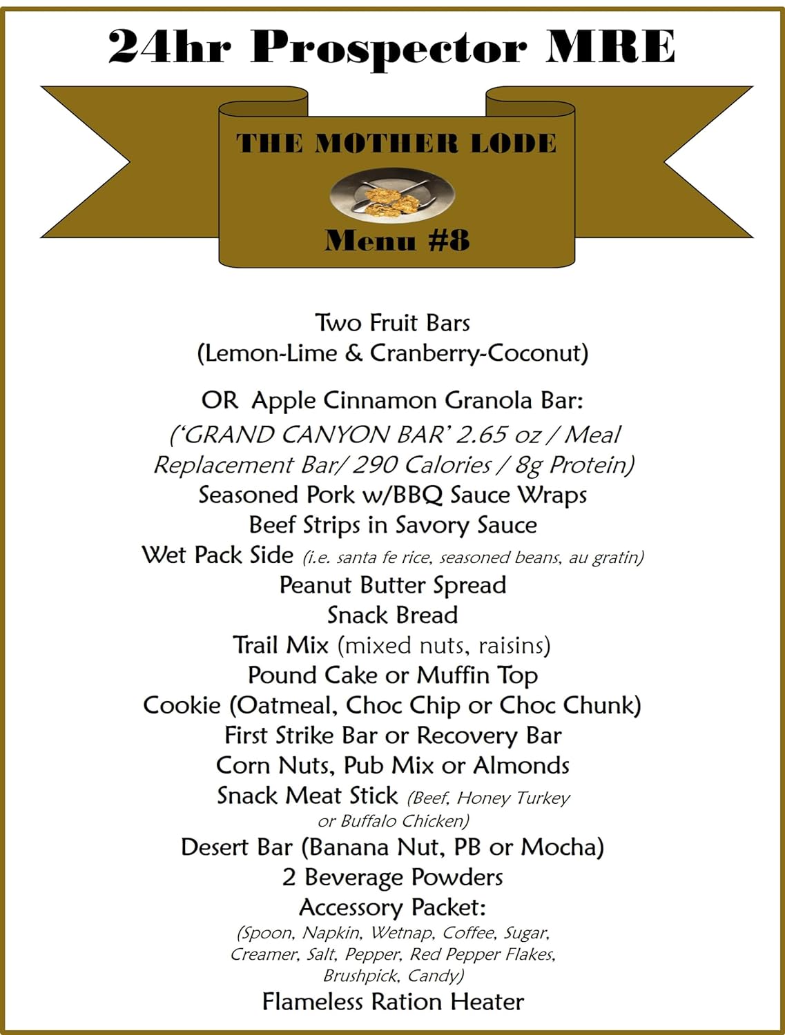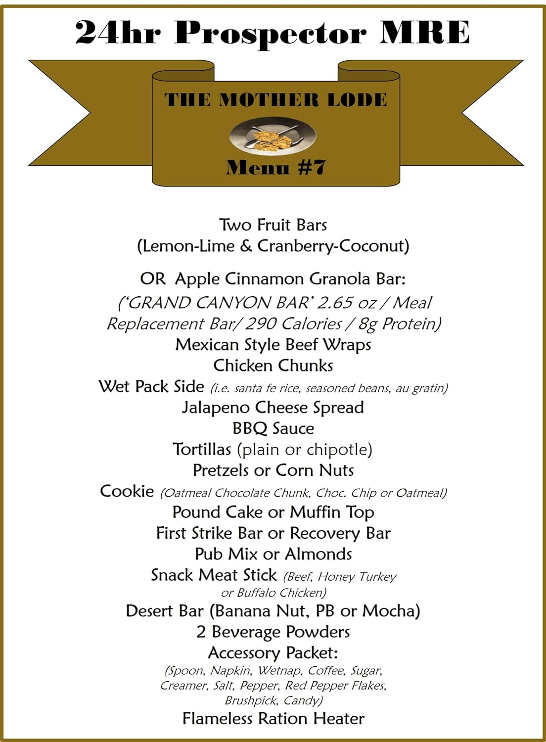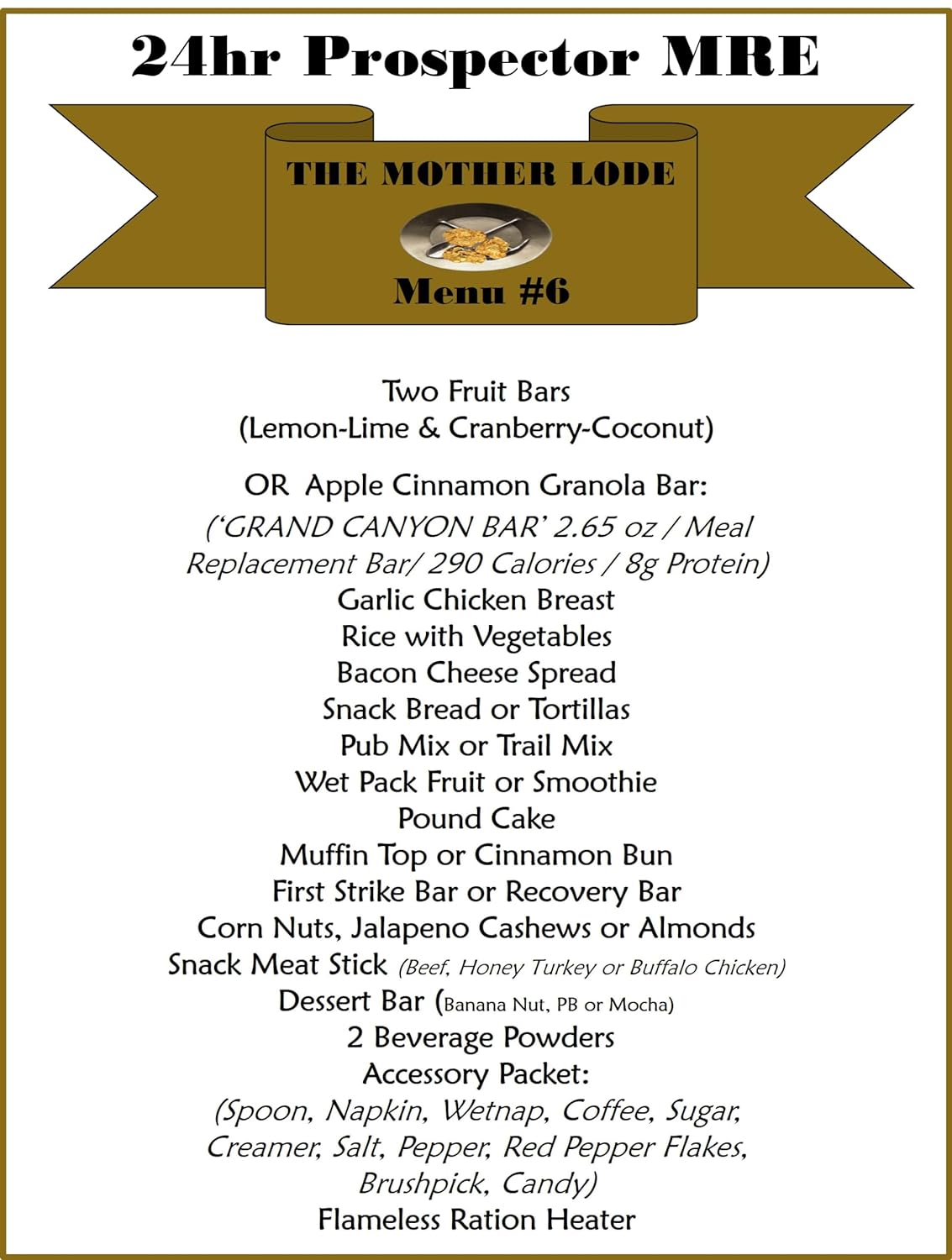 Introducing our latest line of custom MRE’s: 24hr Prospector MRE (THE MOTHER LODE) in menu’s 1-12!