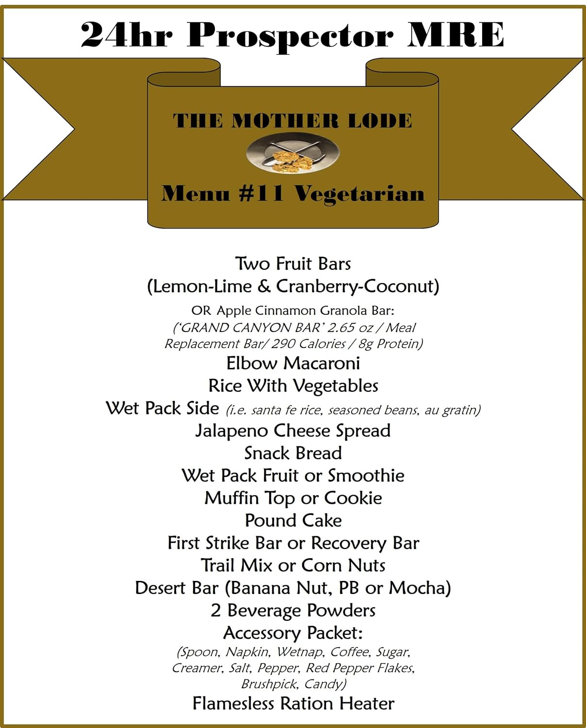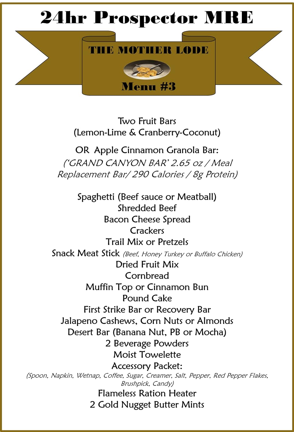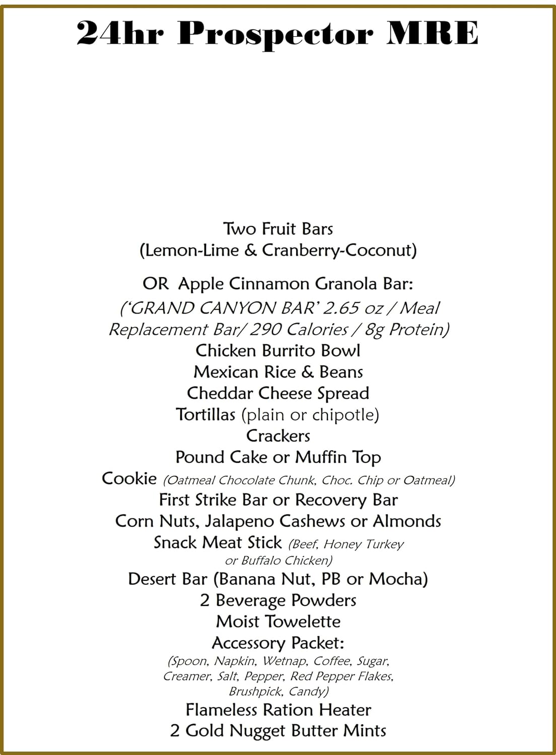 Each 24hr Prospector MRE will feature THREE entrées, snack(s), side(s), desserts(s) two beverages, crushed red peppers, moist fresh naps, utensil pack, a flameless ration-htr, and two Gold Nugget Butter Mint packs! See images for full menu components.
